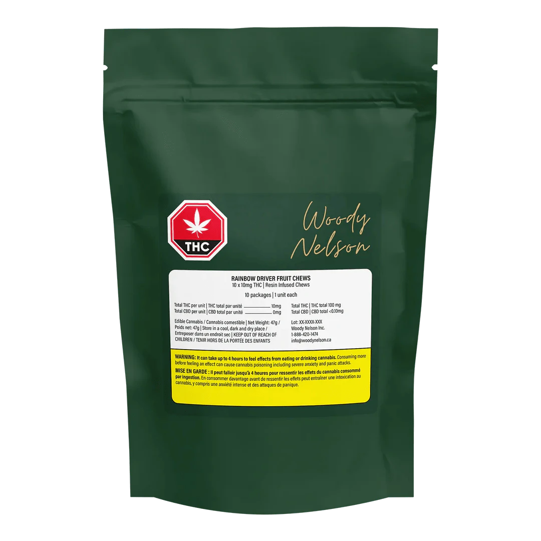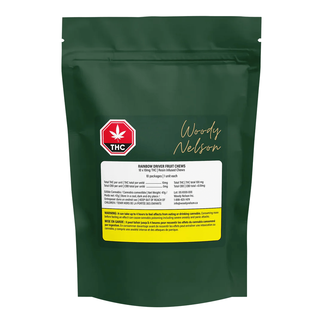 Rainbow Driver Fruit Chews feature Woody Nelson's Rainbow Driver, extracted by Wildcard Extracts, and made into soft, chewy fruit candy by Elevate Wellness. Each bag includes 10 x 10mg THC resin-infused Fruit Chews with notes of citrus and bramble berries. Made in BC.